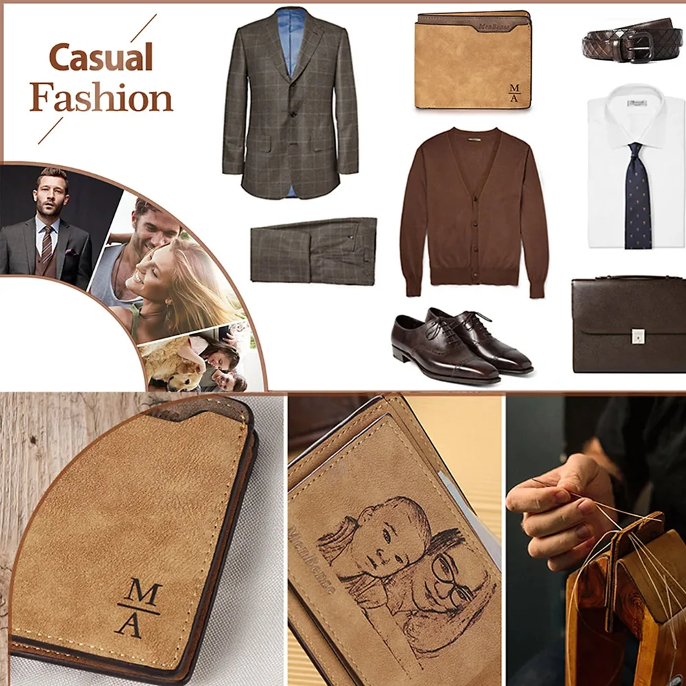 Personalize your everyday carry with this slim, stylish men’s wallet — featuring custom name engraving, a coin pocket, photo slot, and card holder in a sleek frosted leather finish.
