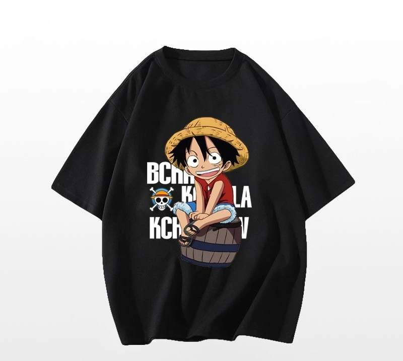 Heavy Black ONE PIECE Luffy Cartoon Printed Cotton T-Shirt – Trendy Japanese Style for Men & Women